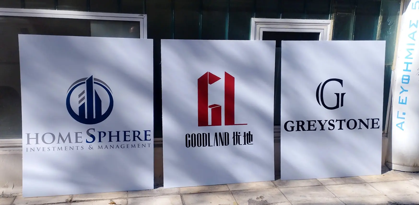Πρόκειται για επιγραφές με υλικό κατασκευής το αλουμίνιο, ηλεκτροστατικά βαμμένο. Στο πίσω μέρος κατασκευάζεται σκελετός από στρατζαριστό σίδερο για το σωστό δέσιμο της κατασκευής. Μπροστά μπαίνει ψηφιακή εκτύπωση ή έγχρωμα αυτοκόλλητα βυνίλια.