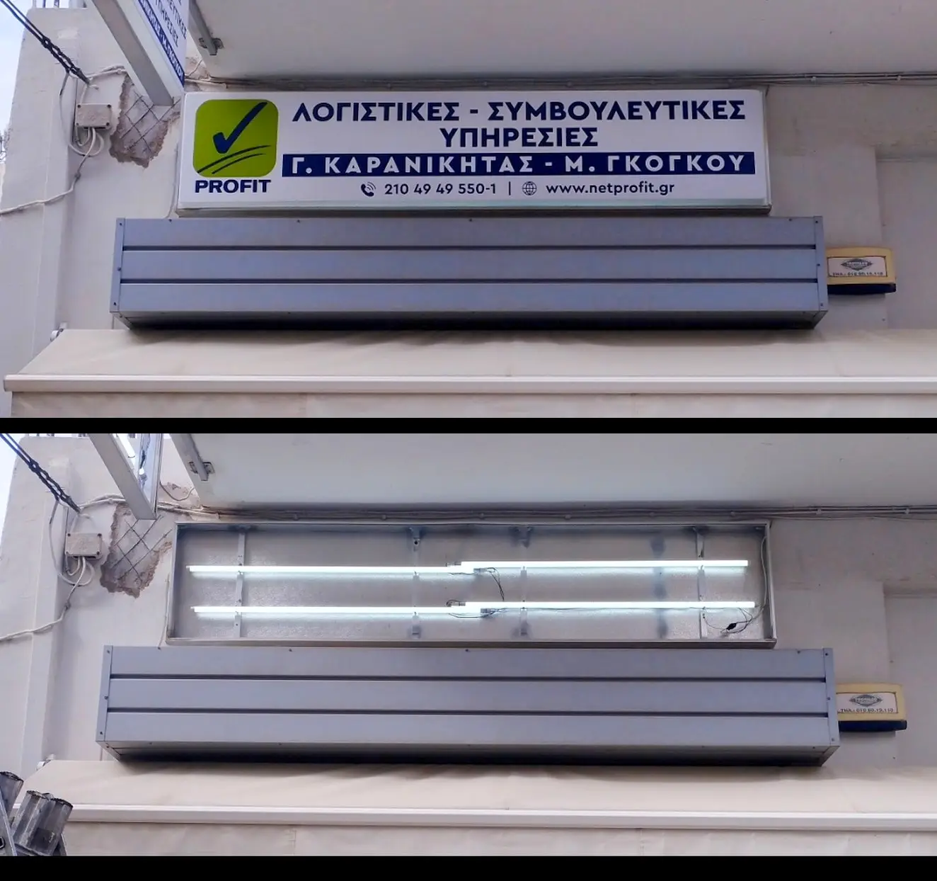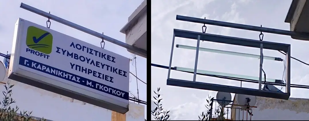Οι φωτεινές επιγραφές κατασκευάζονται από ανοδειομένο ντουραλουμίνιο, ενώ η όψη τους κατασκευάζεται από μουσαμά Panaflex ή από Plexi Glass. Ο φωτισμός δημιουργείται από λάμπες τύπου T8 LED, στο εσωτερικό της κατασκευής. Οι επιγραφές αλουμινίου δίνουν ένα πολύ καλό αποτέλεσμα με μεγάλη αντοχή στο χρόνο. Τα κείμενα της επιγραφής δημιουργούνται από έγχρωμα αυτοκόλλητα βινύλια ή ψηφιακή εκτύπωση.